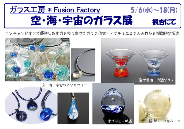 ガラス工房 Fusion Factory 空 海 宇宙のガラス展 は明日までです ご来店お待ちしております ハンドクラフトとフェアトレードのお店 楓杏 ふうあん 稲田堤日記