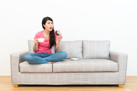 エレガントな美しい女生徒の白い背景を持つ木製の床で 幸せ感じてソファ ソファに座ってホットの飲み物を飲む の写真素材 画像素材 Image