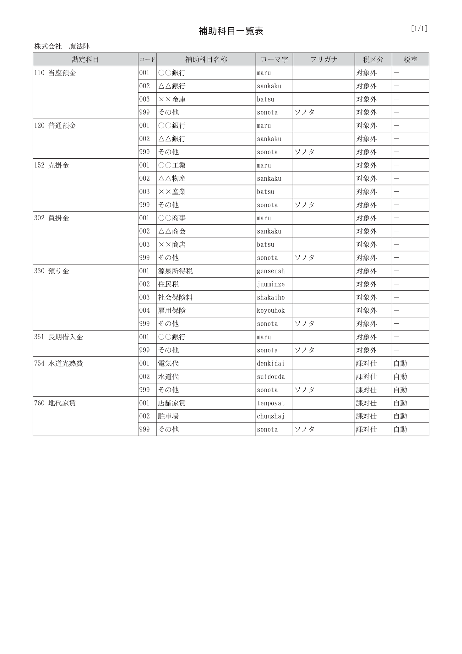 補助科目一覧表 魔法陣会計クラウド